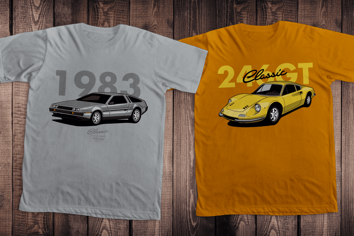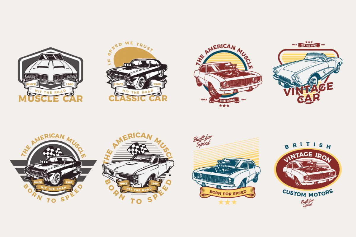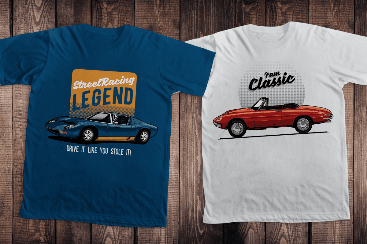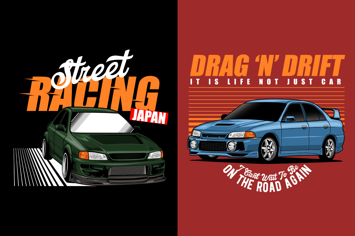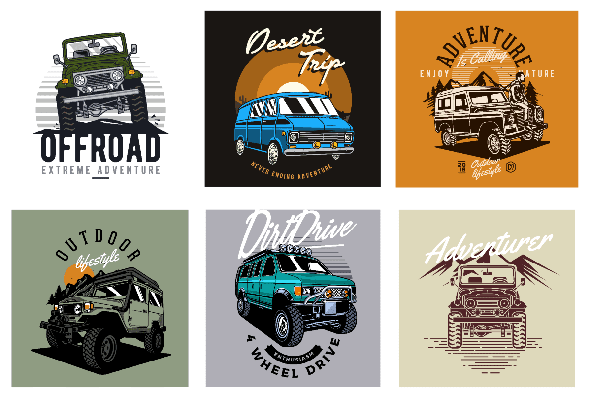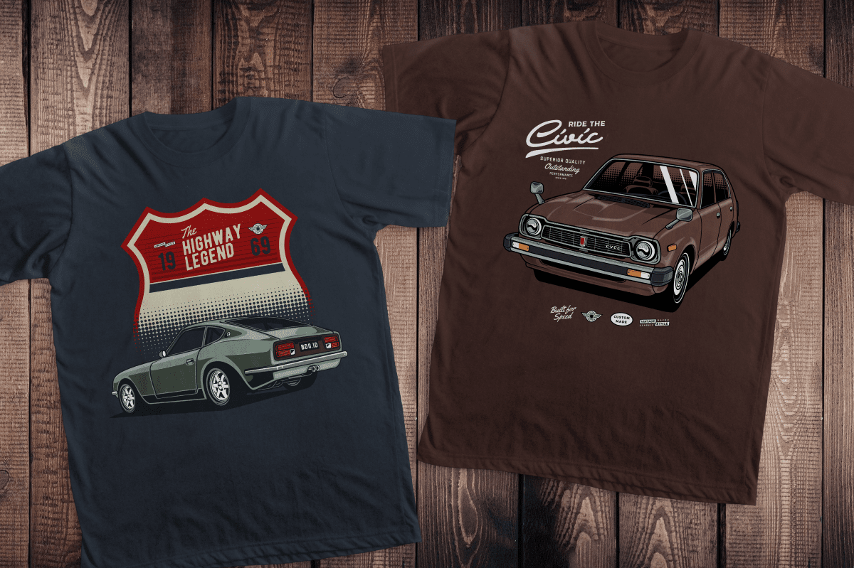 A big bundle of vector car illustrations with over 150 unique depictions of classic cars, american muscle cars, hotrods, japanese cars, offroad vehicles & trucks delivered in 100% vector source files as well as print ready raster files that you can use on for your digital designs and print projects – create t-shirt designs, posters, flyers, branding, logos and more using these awesome designs!