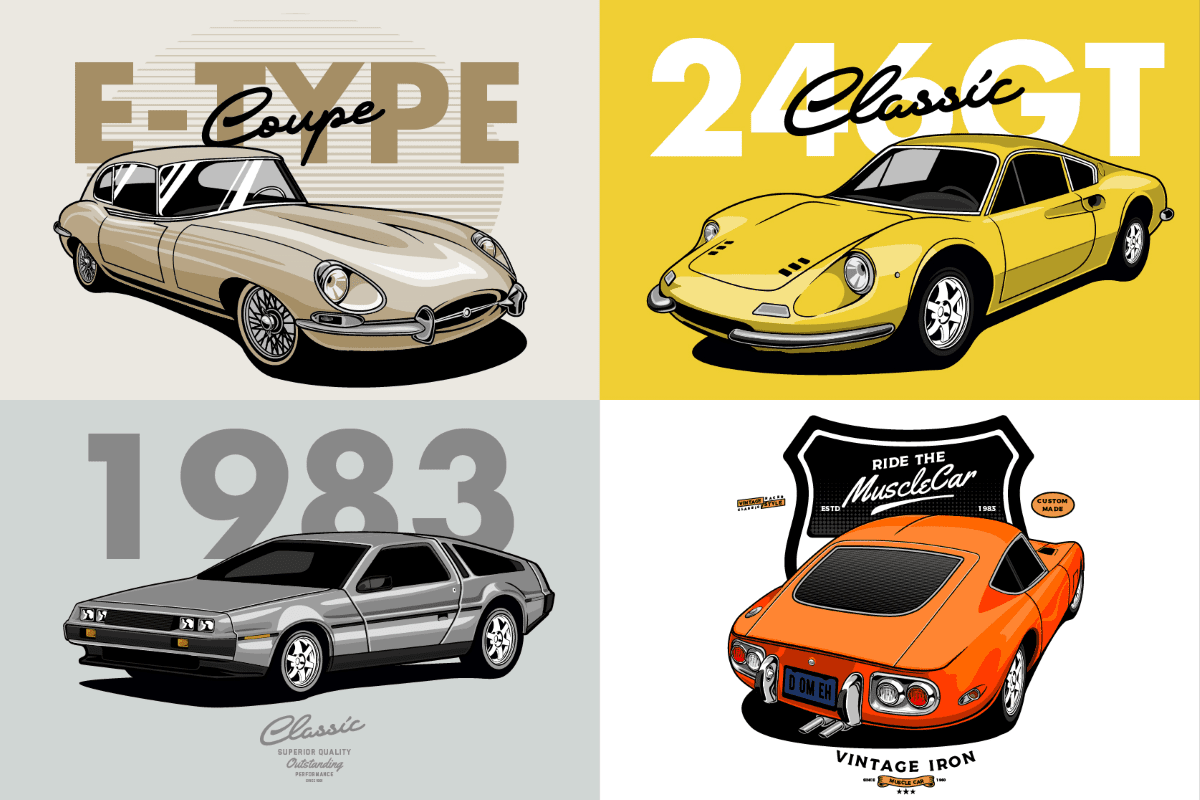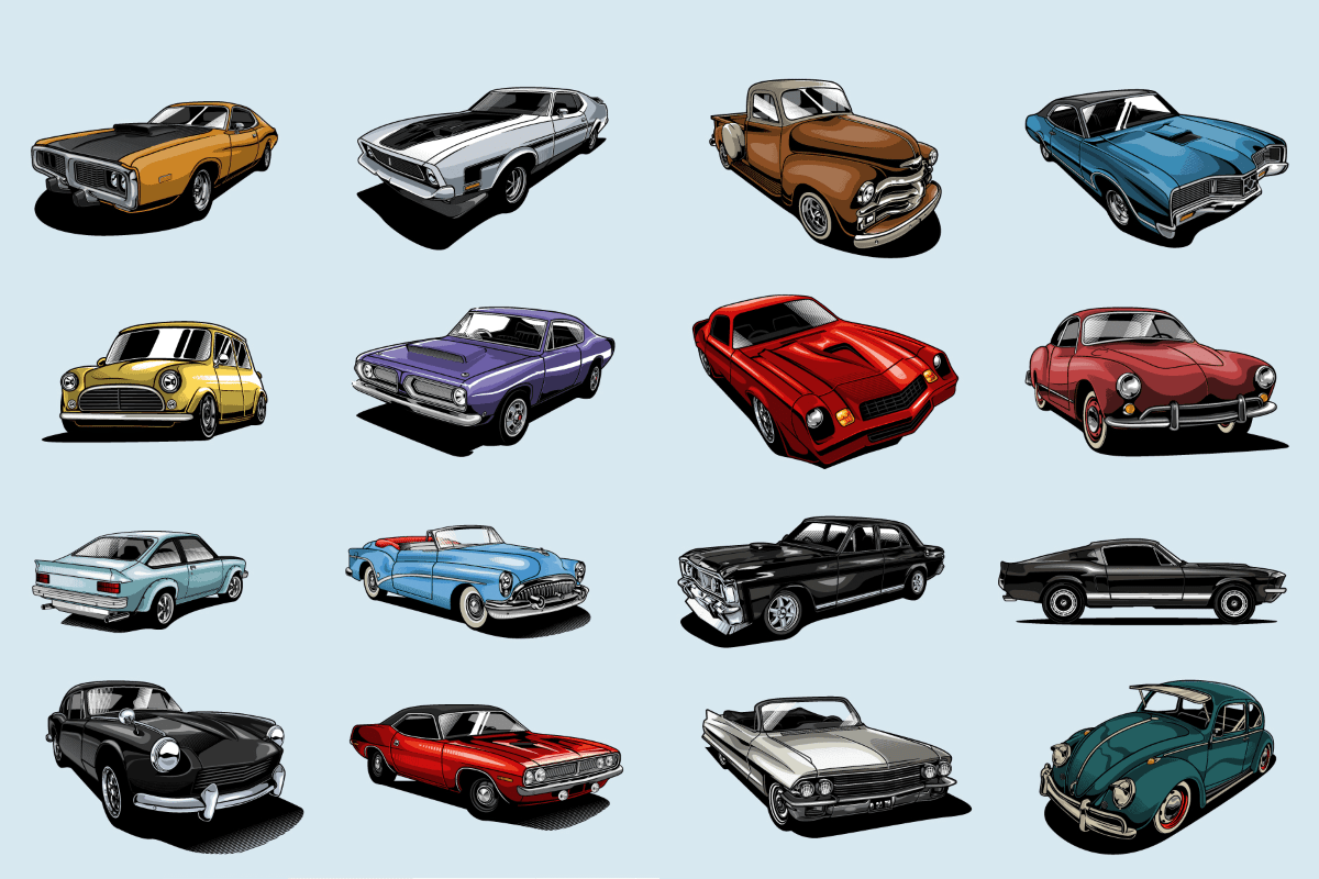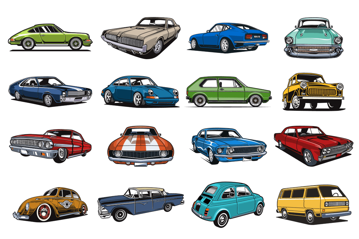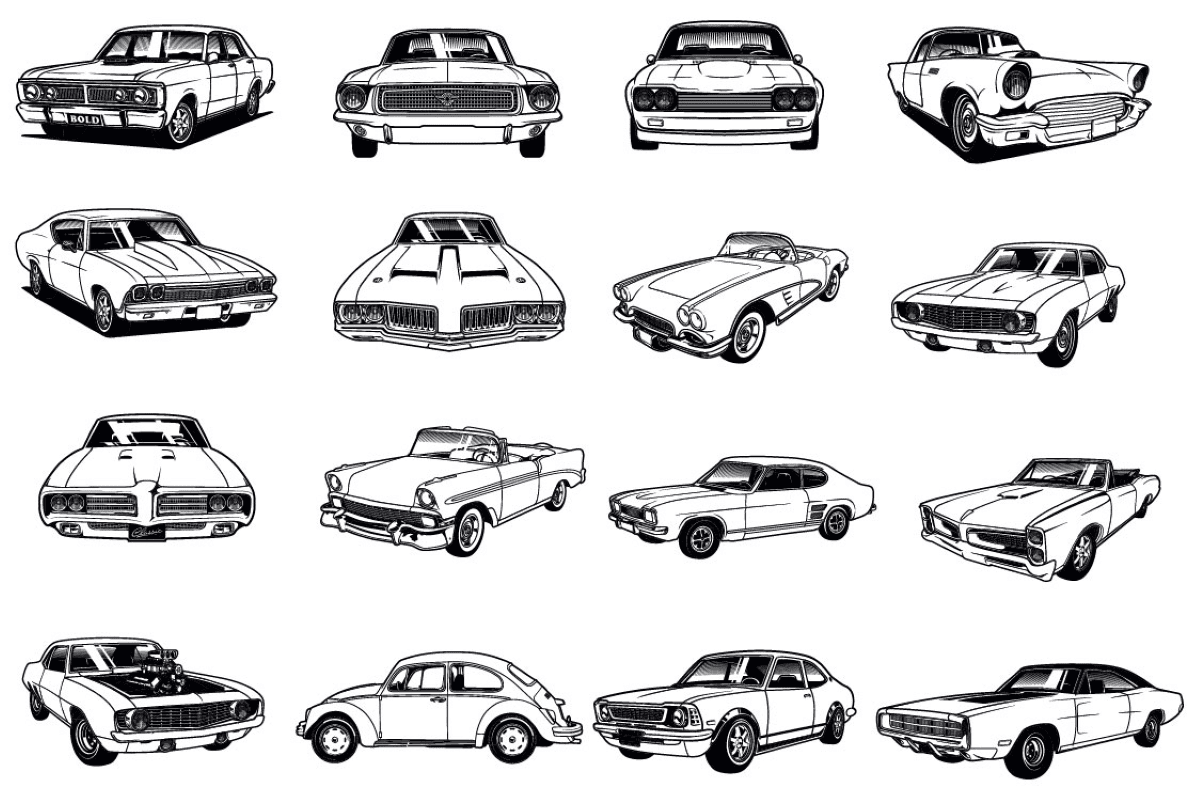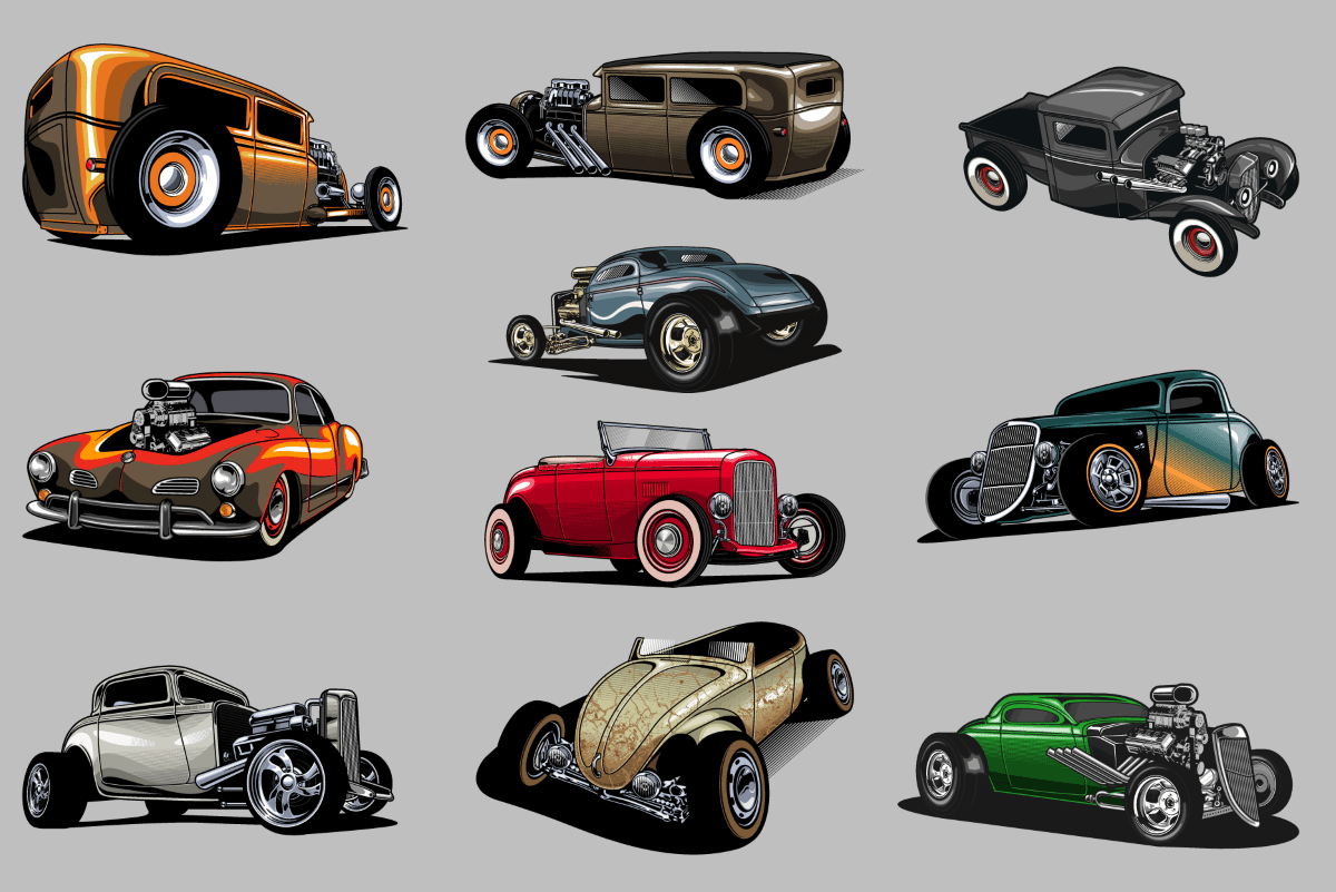 Vector Car Illustrations Pack – Hotrods, American Muscle Cars & Japanese Vehicles & More
