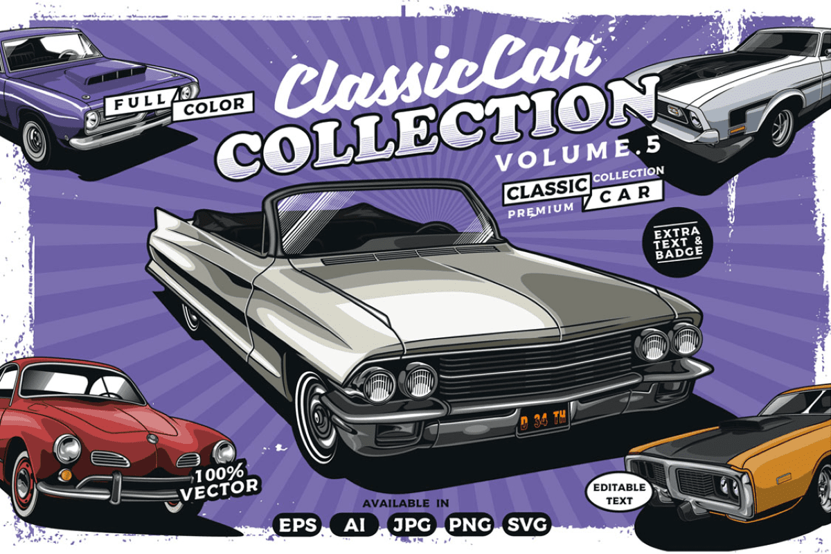 The pack delivers every car illustration in 3 vector formats, including Ai files for Adobe Illustrator as well as SVG & EPS vectors for other vector compatible software like Inkscape and GIMP – fully layered and editable, organized and easy to work with; you can change the colors, resize, add and remove elements, change the texts (yes, the texts are editable!) and customize the illustrations completely to you liking