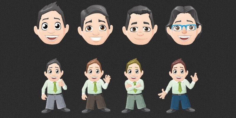 An Illustrator generator of over 1000 possible combinations for vector characters representing business men and women featuring 22 extra non-business related characters, different body types, hairstyles, and several sorts of eyes, mouths, noses, glasses and clothing and body gestures.