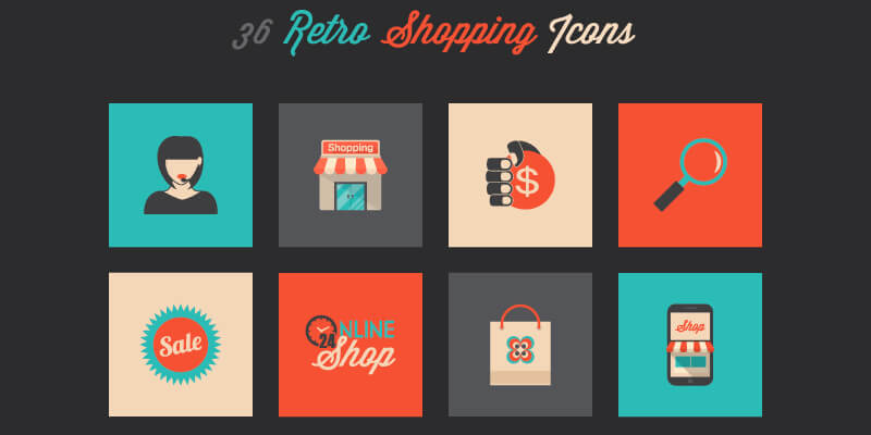 A free set of vector shopping icons with a retro style. They are flat, but the pale color tones used make them look like from another age. Of course, the design of the icons also matters, for instance, they resemble those old adverts from WW2 and post war. These icons can be edited with Photoshop, Illustrator and any other program that admits working with vectors.