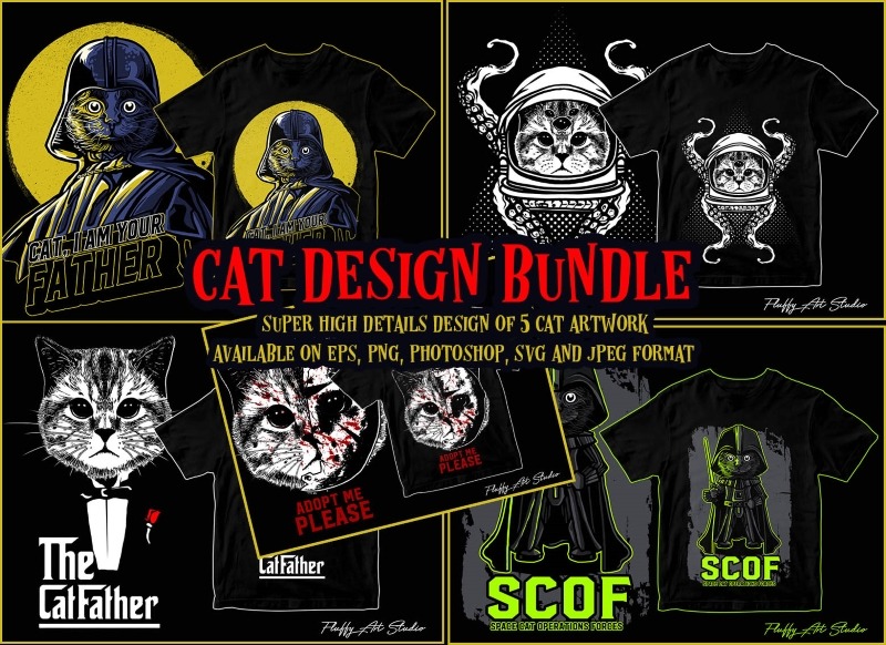 A collection of 70+ vector t-shirt designs featuring a variety of illustrations with different characters and themes like astronauts, mythological figures, animals, halloween designs & many others, perfect for Print on Demand services, delivered with 100% vector sources as well as print-ready files that you can offer to your customers and clients right away on your portfolio