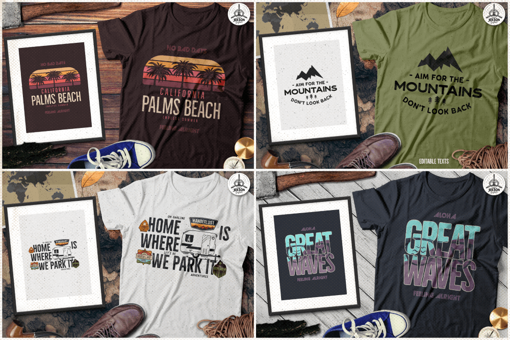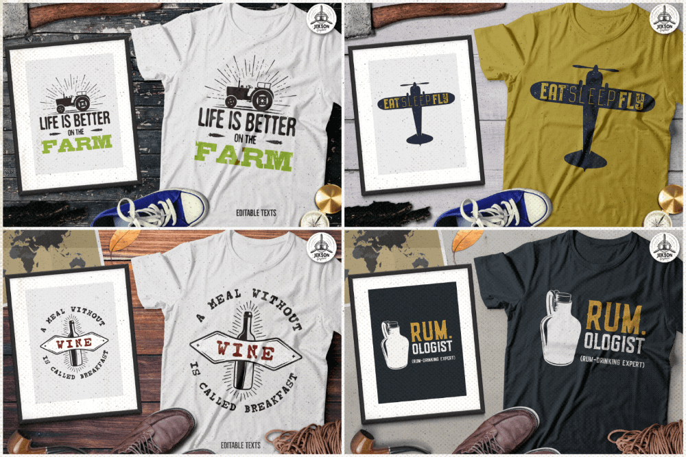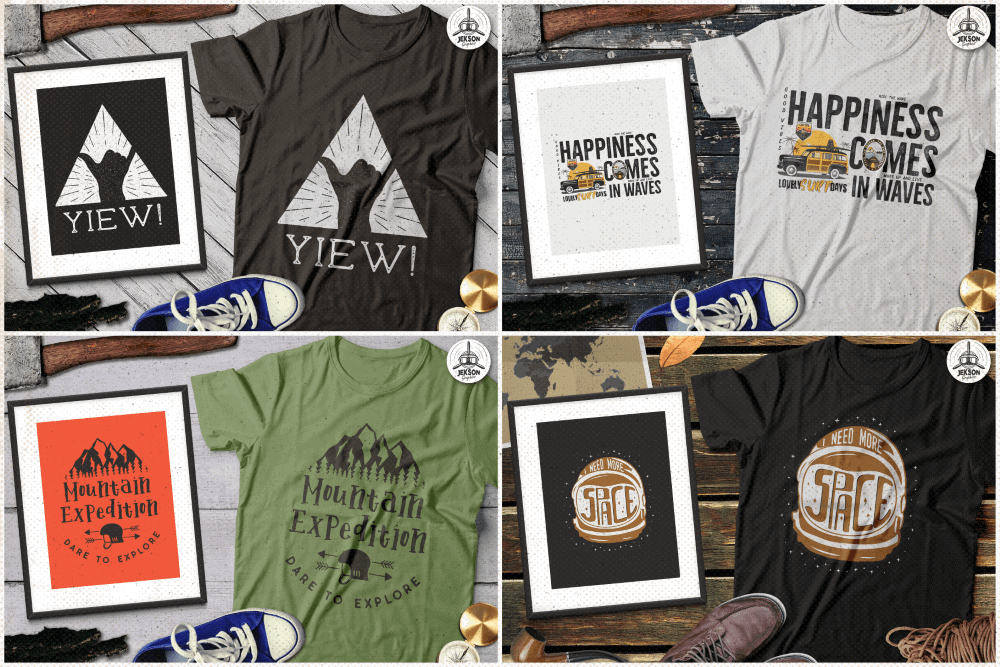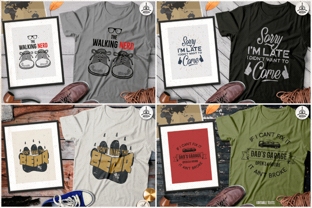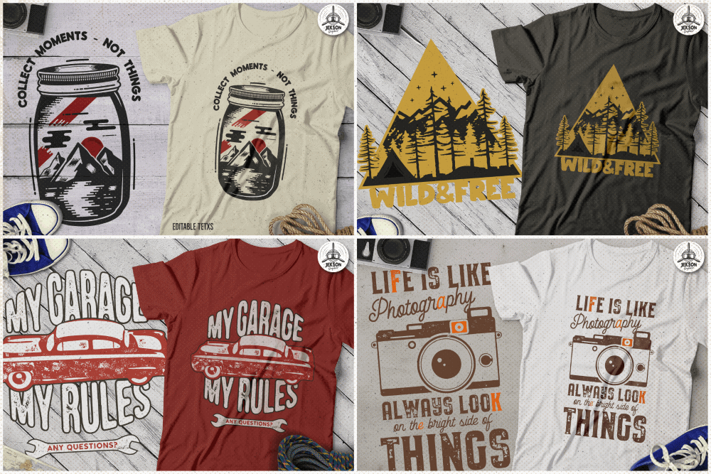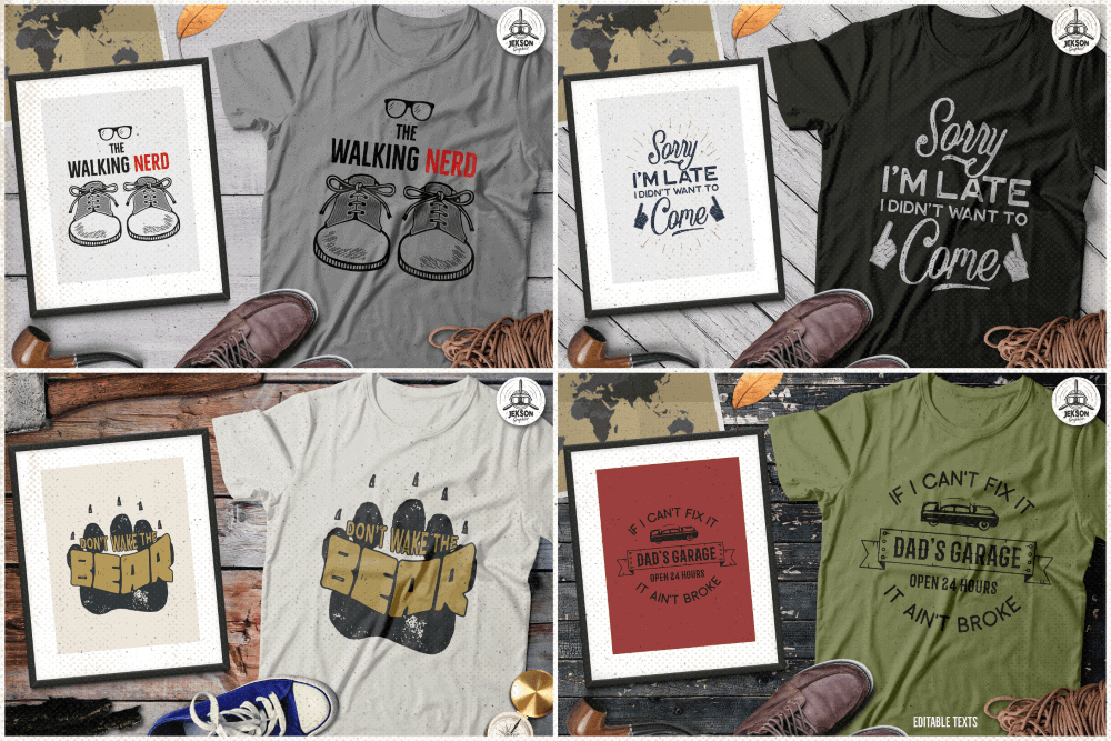 A brand new collection of vector t-shirt designs featuring 180+ designs with quotes, slogans, illustrations and badge designs delivered in fully editable and layered files, featuring different styles of illustration from calligrams to cartoons, stamps, drawings and many others.