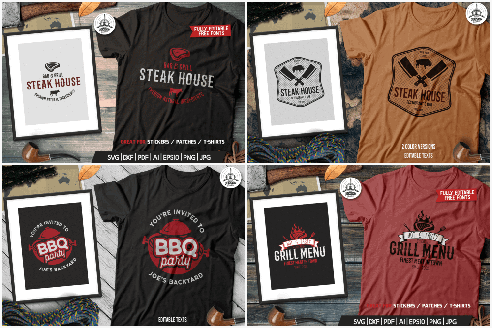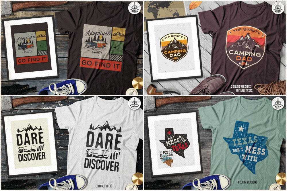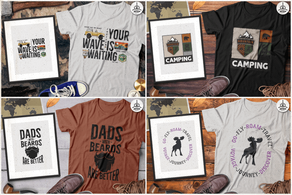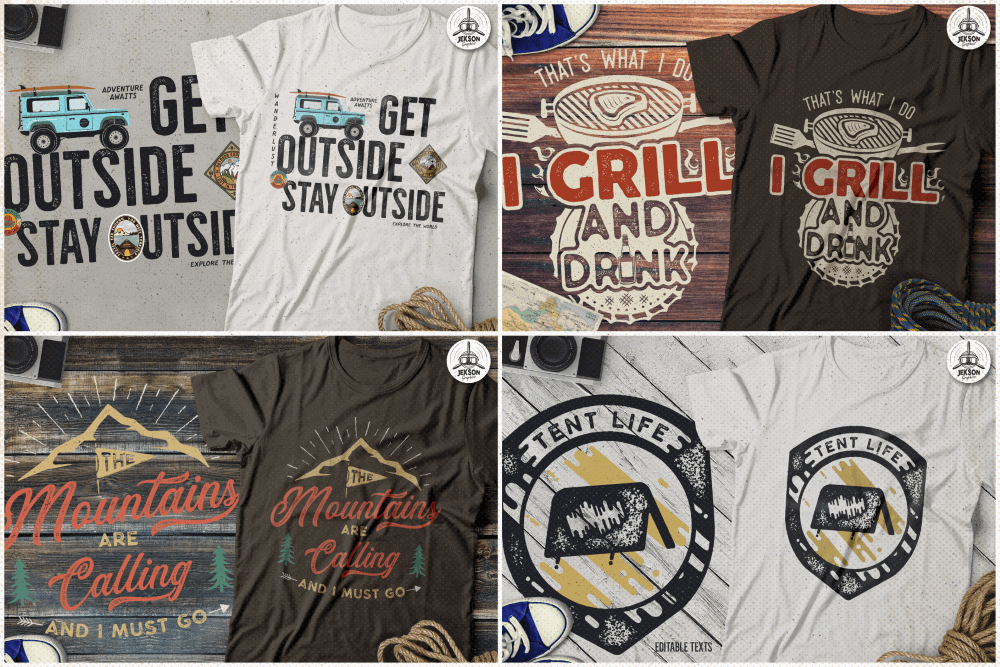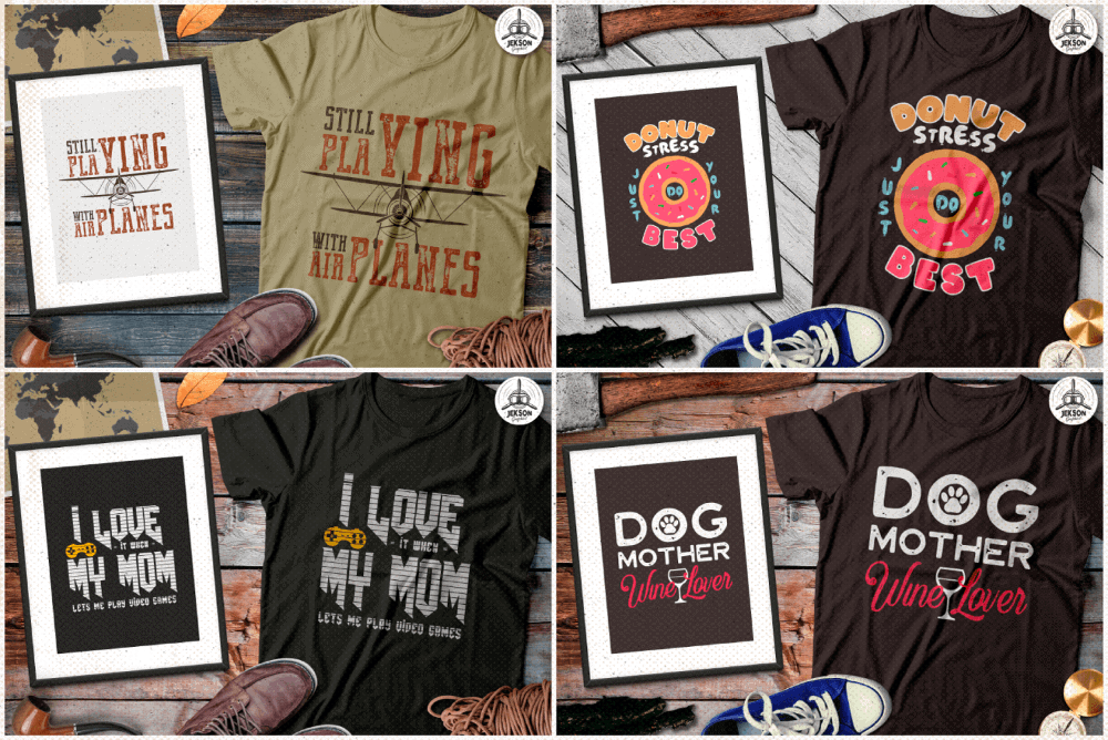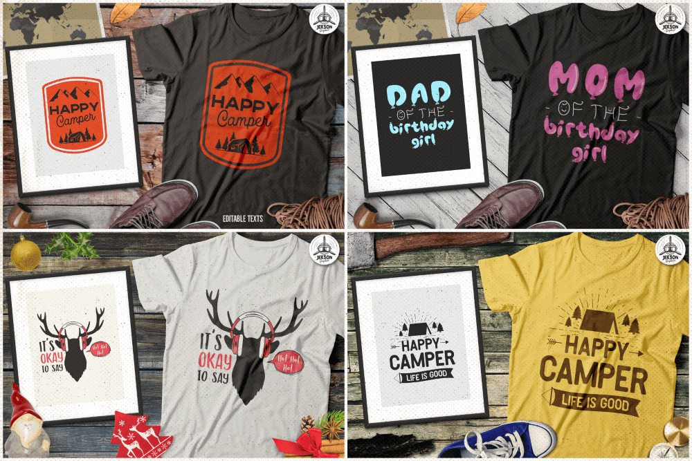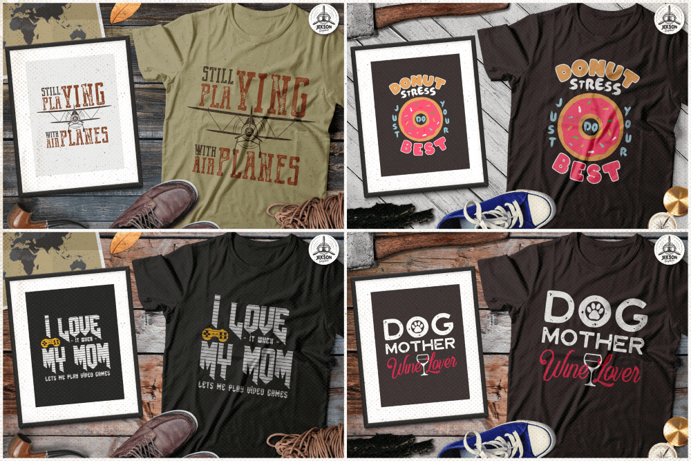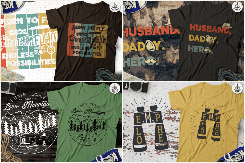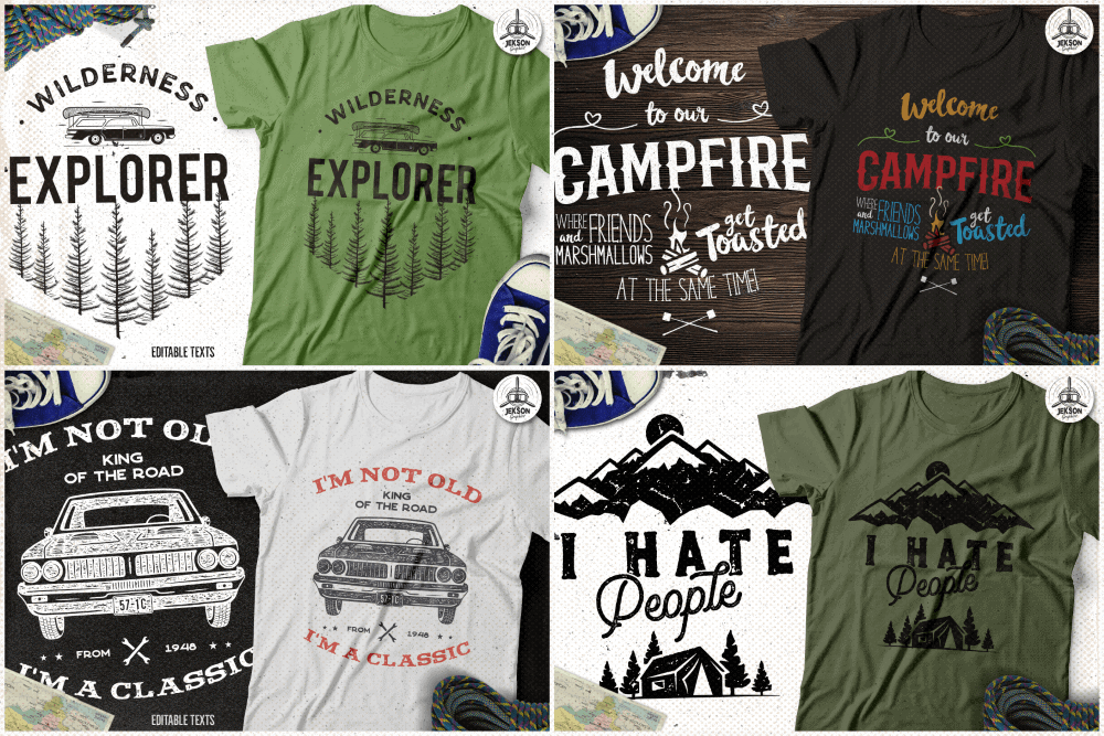 The package delivers every t-shirt design in AI & SVG format, and also includes other editable formats like EPS, DXF, PSD & PDF. Additionally, every illustrations includes a print-ready version in high resolution PNG format with large, 5000x5000px and 300dpi.