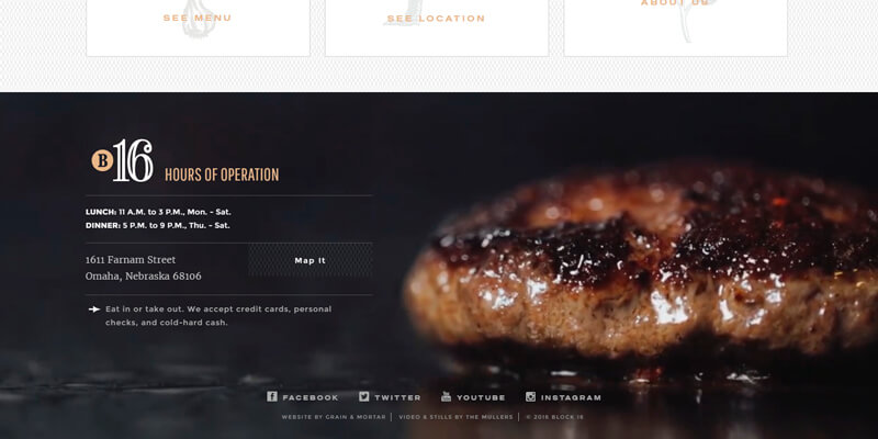 An amazing idea for restaurant or food services website footer that features a video of a piece of meat sizzling as the background of the site’s logo, opening hours, address, map button, and social network icons.