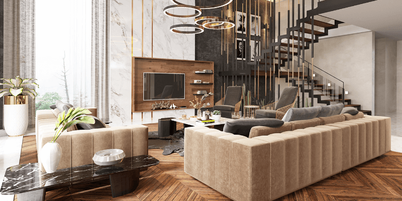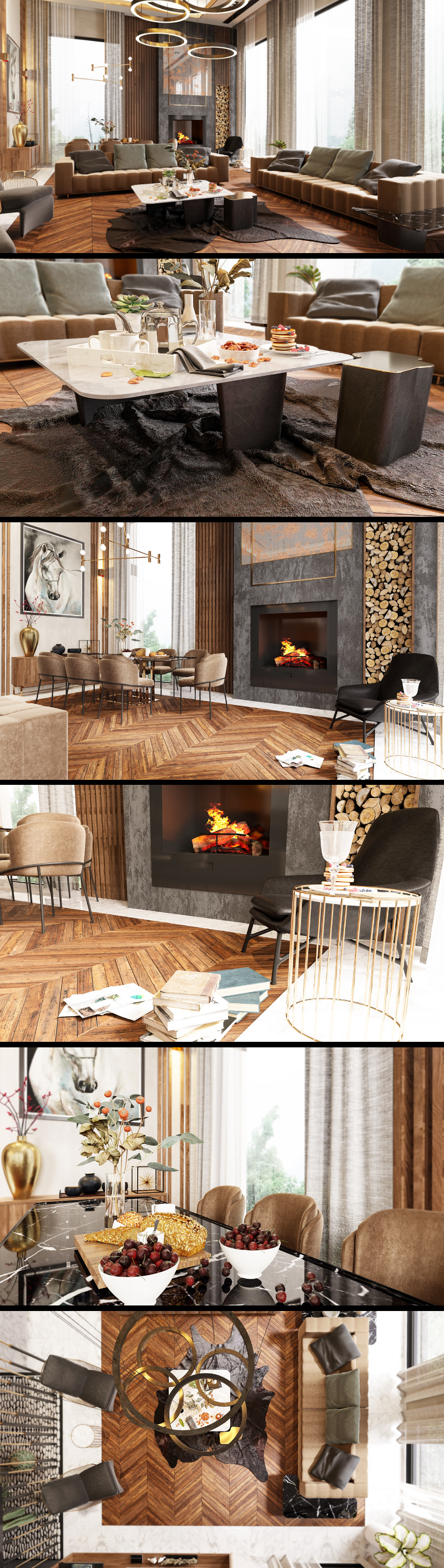 A 3D living room scene modeled with 3ds Max, mapped with Photoshop and Rendered with Corona. The general interior design concept combines a coastal loft style in Antalya Turkey with some mid-rustic modern elements. Created by Behance user Ferhan Akyüz.