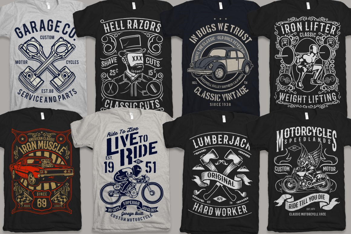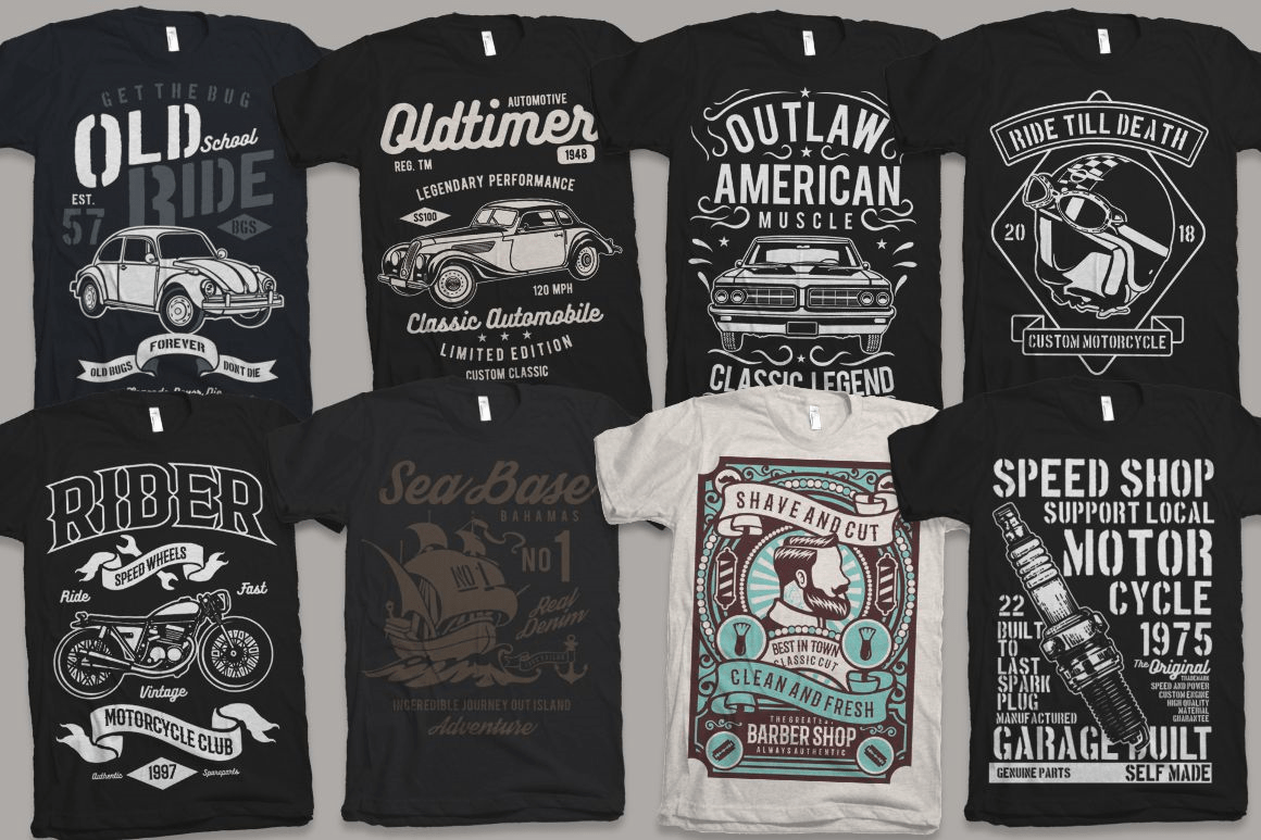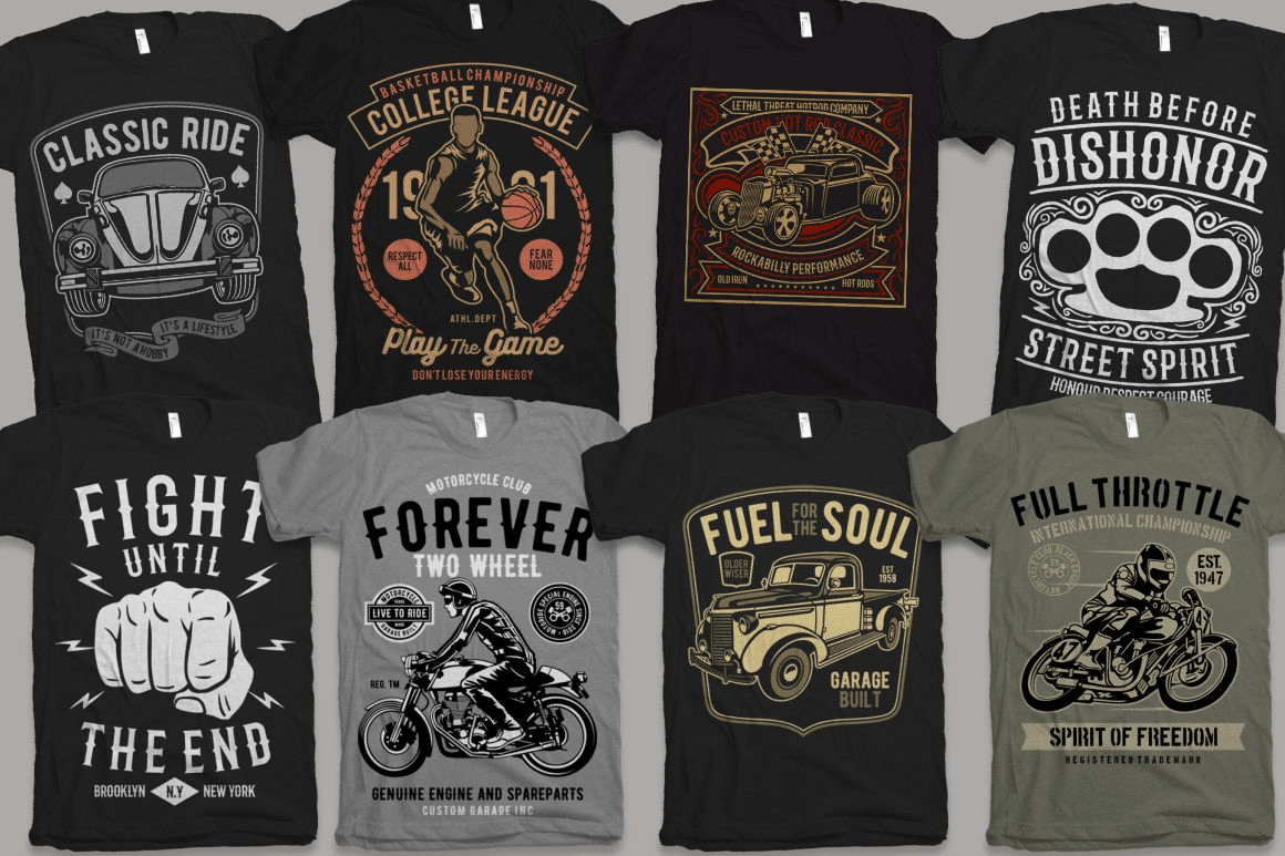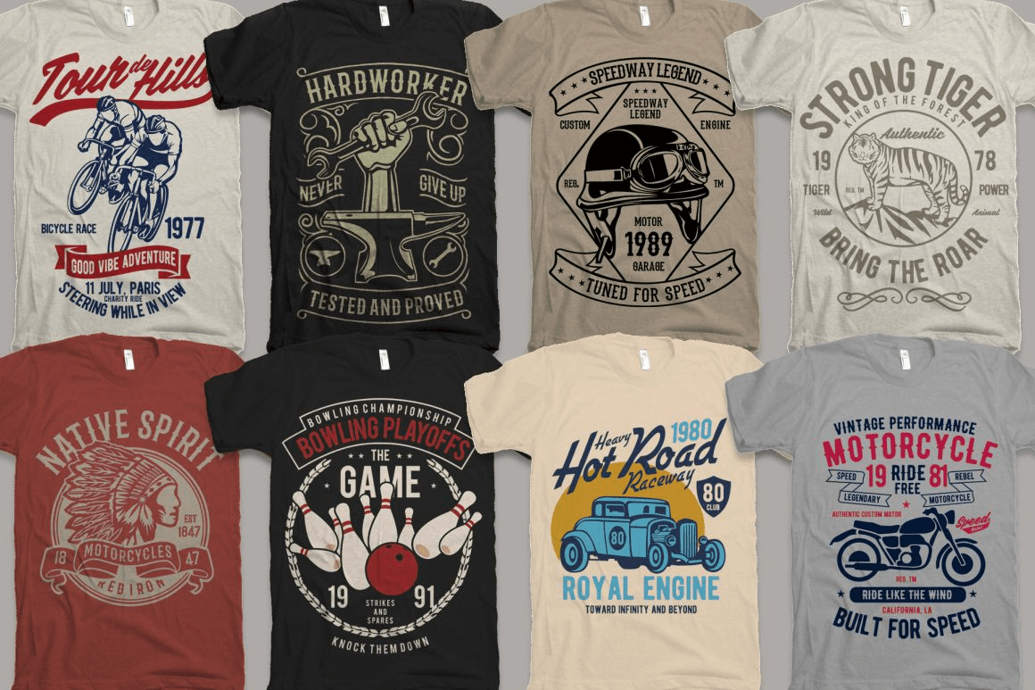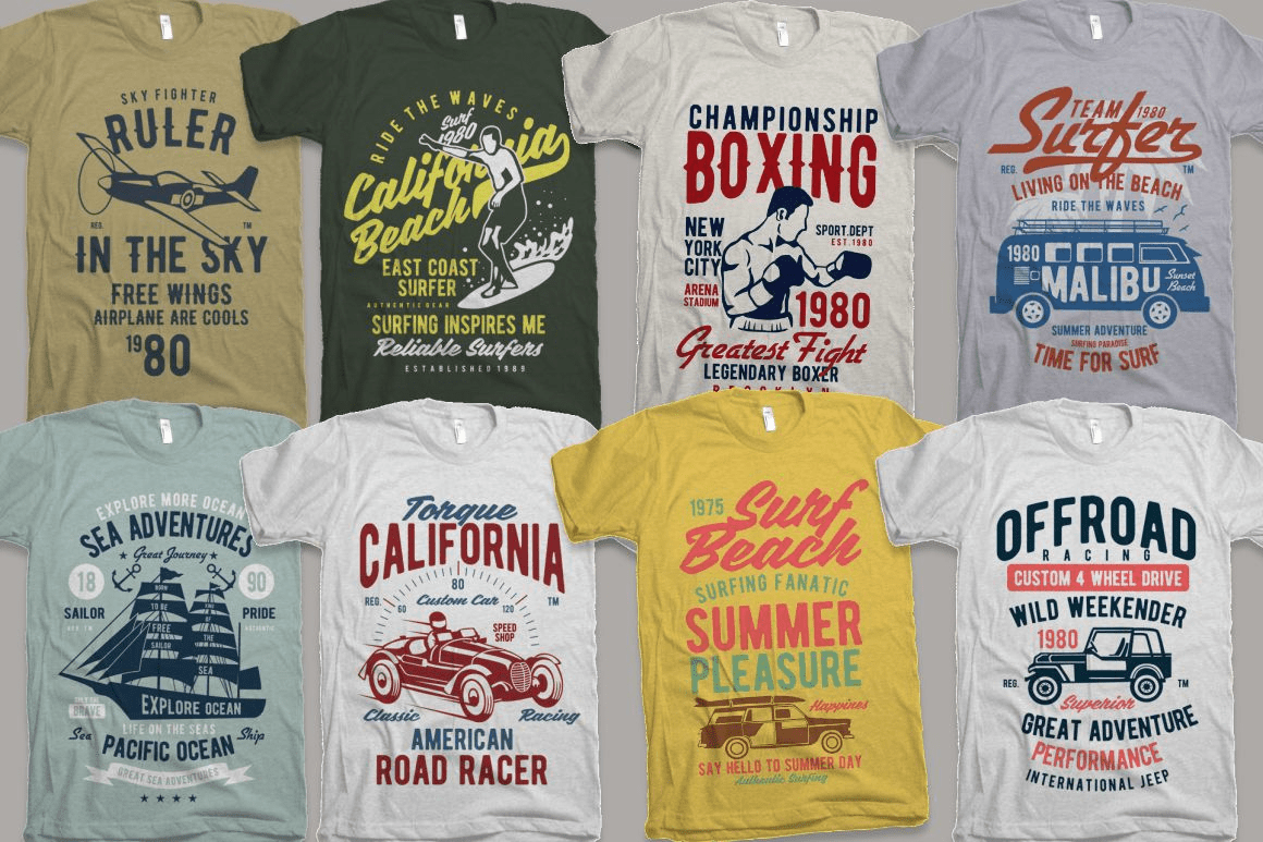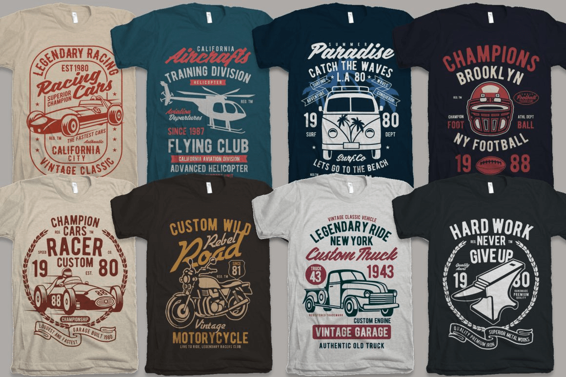 All new vintage t-shirts bundle featuring 200 unique illustrations for merchandise, perfect for t-shirt prints, featuring various themes including sports, vintage motorcycles & cars, boxing, airplanes and many others, and delivered with 100% vector sources as well as print-ready full color files that you can start using on your shop’s products straight out of the box