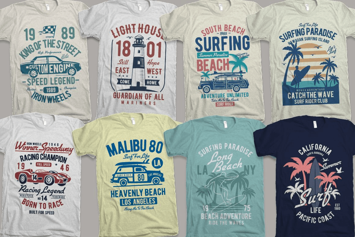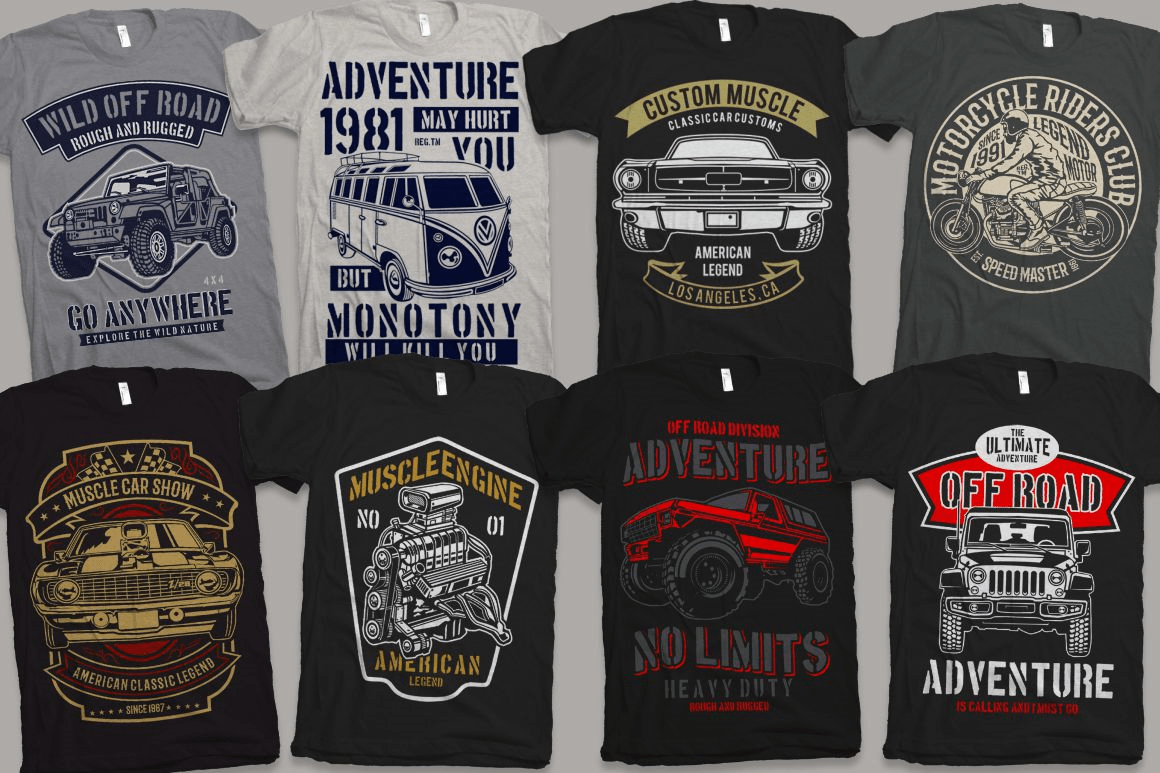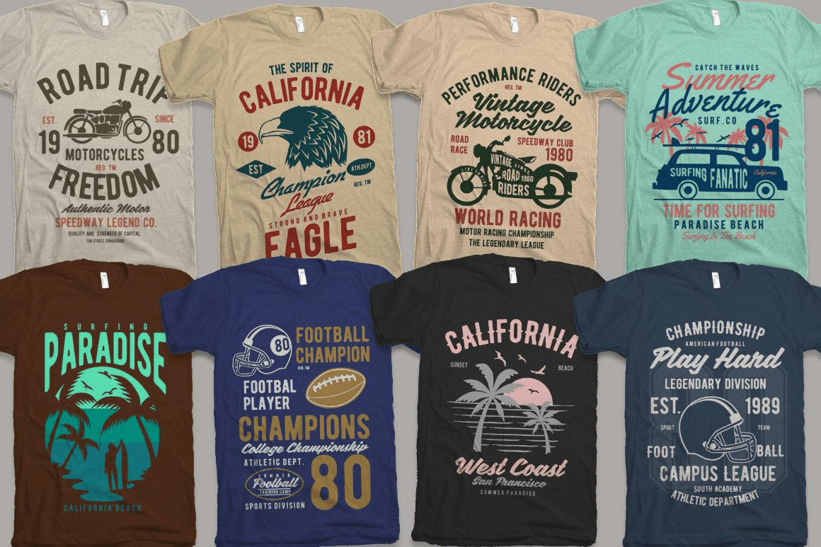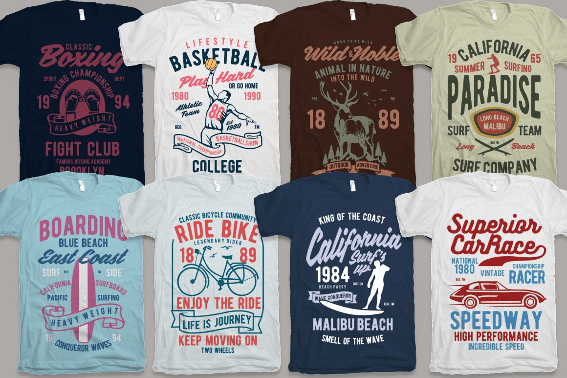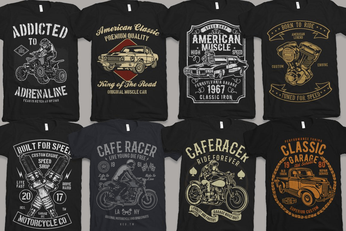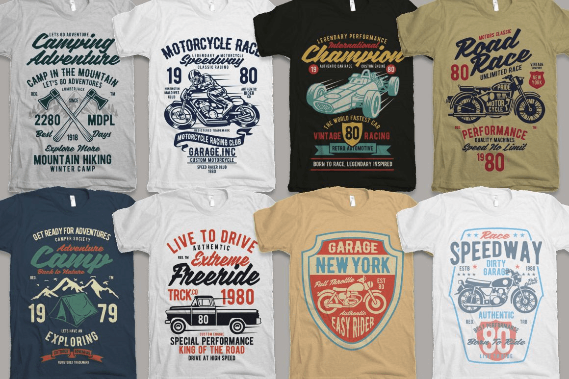 All new vintage t-shirts bundle featuring 200 unique illustrations for merchandise, perfect for t-shirt prints, featuring various themes including sports, vintage motorcycles & cars, boxing, airplanes and many others, and delivered with 100% vector sources as well as print-ready full color files that you can start using on your shop’s products straight out of the box