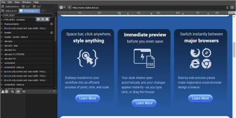 The ultimate tool to help you burn through your CSS styling process with holy fire. Available for PC & Mac, this feature-rich software comes packed with powerful tools like side-by-side browser preview panes to pinpoint issues across platforms, tree DOM explorer, an intuitive interface where you can edit exactly where & how you want with its Bullseye functionality, tools for pixel perfection, integrated FTP client