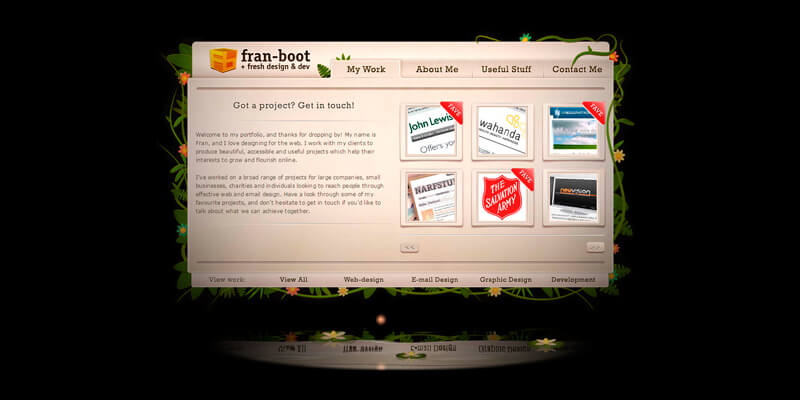 A very creative idea for footer design that simulates reflections of water that highlight the navigation elements at the bottom of the main container of the page.