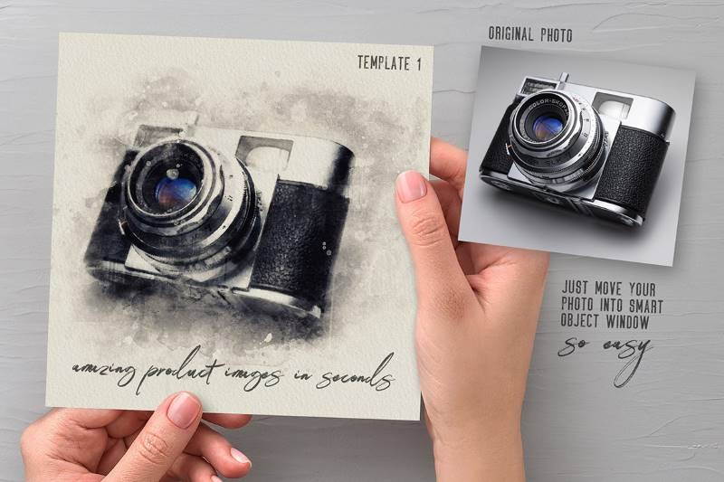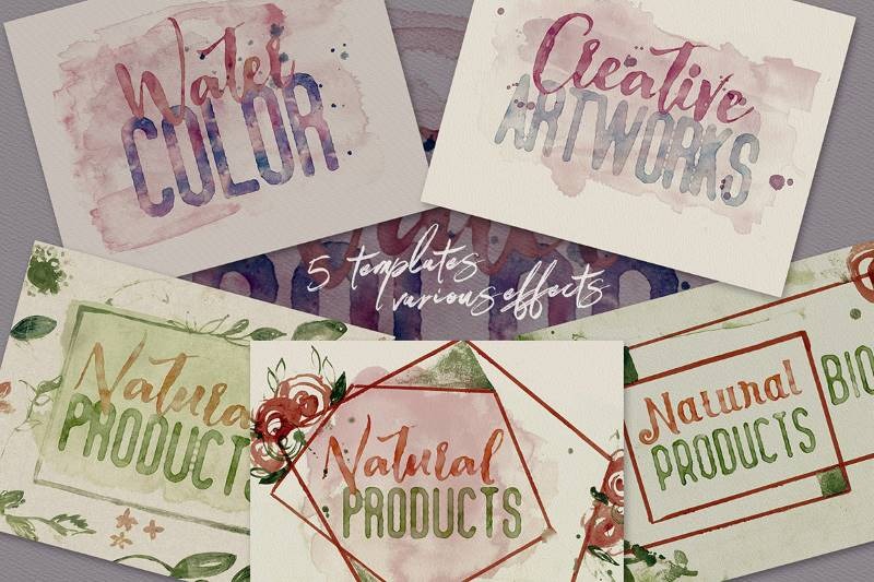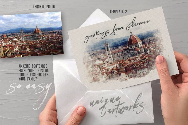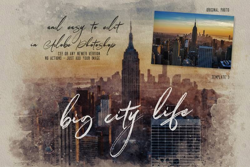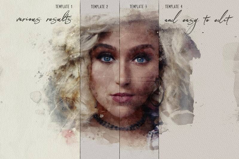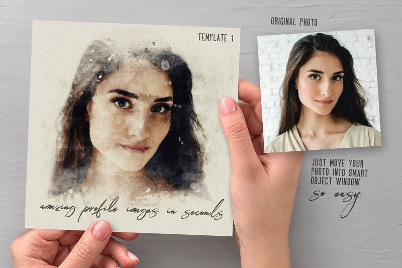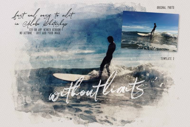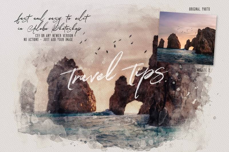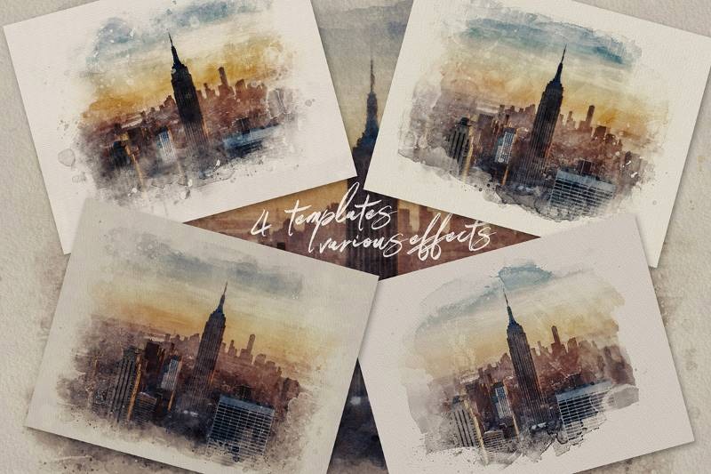 Easily create original watercolor painting from photos in minutes using the premade templates, drop your imagery in the smart object and you’re good to go! All these templates & graphics are hi-res so really great for any print or web projects – maybe it’s time to add something creative and unique to your graphics toolbox