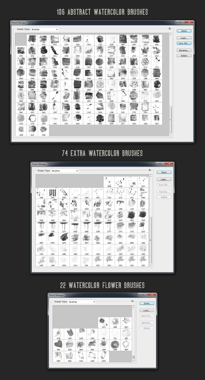 - 202 various watercolor brushes – in 3 sets – hi-res ABR brush files for Adobe Photoshop CS6 or newer – you can create own brushes from PNG shapes if you have older Photoshop version