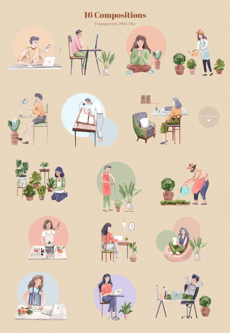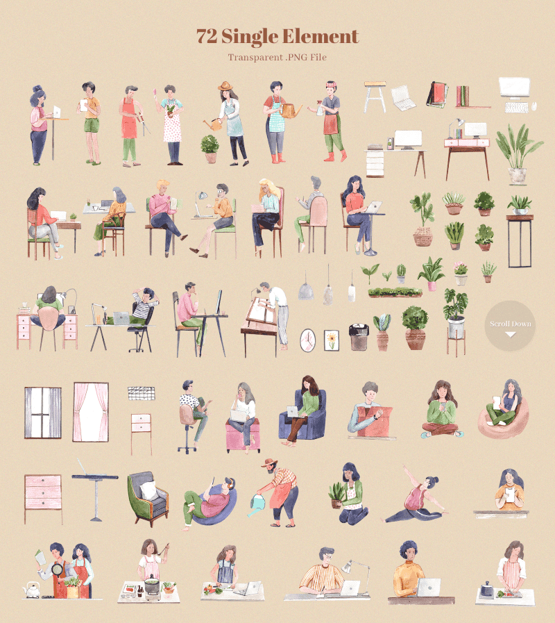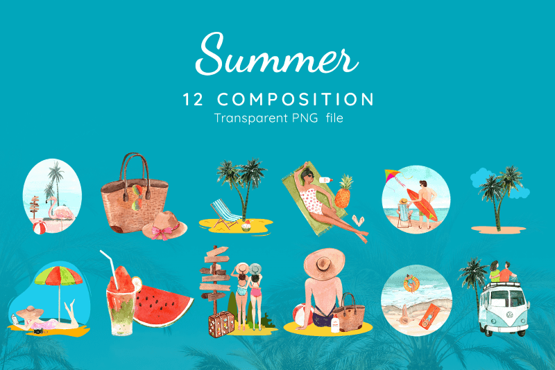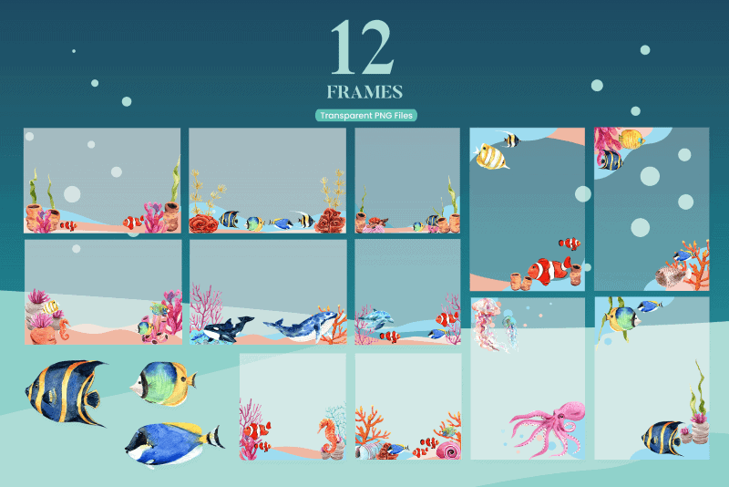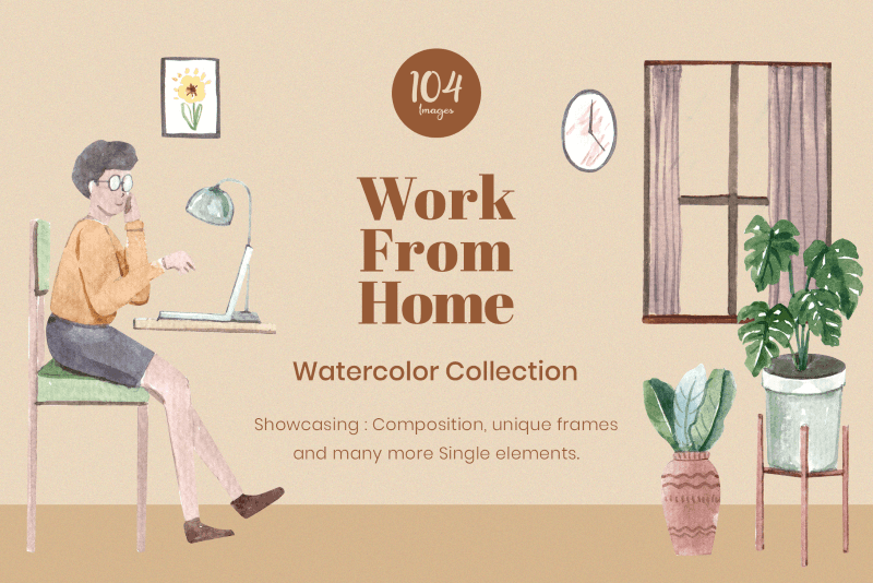 The pack delivers every design element in high resolution transparent PNG format, print ready at 300dpi, and includes floral designs, frames, borders & compositions, undersea scenes & animal illustrations, food & bakery elements, people illustrations with work-from-home themed scenes & objects; 300+ compositions across the different themes included in the pack, as well as print templates, seamless patterns, borders & decorative frames, etc