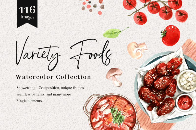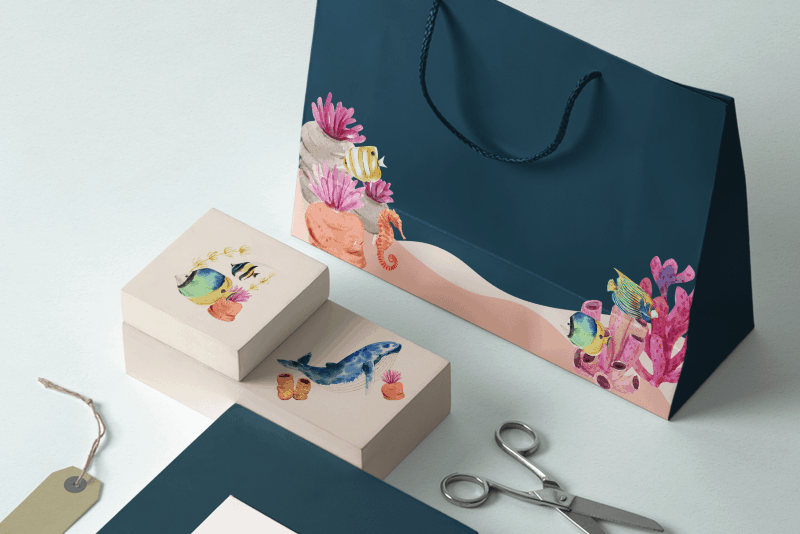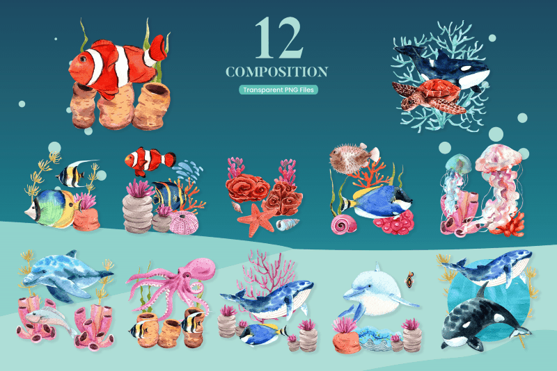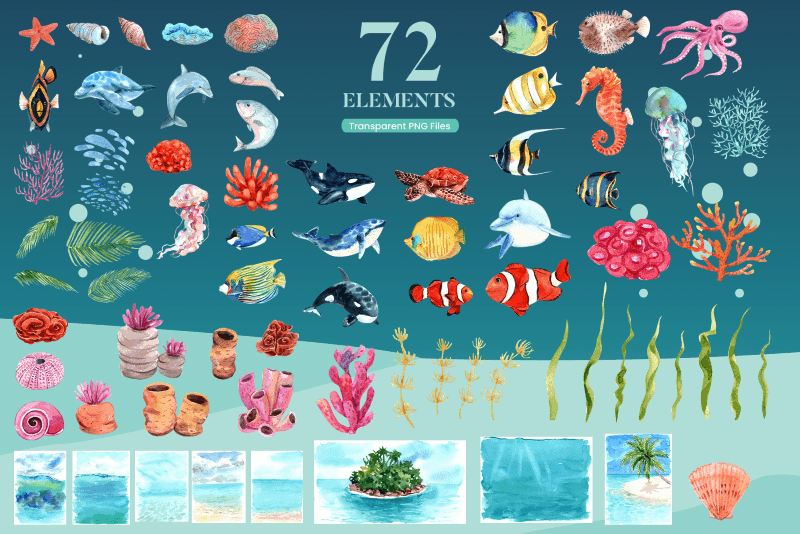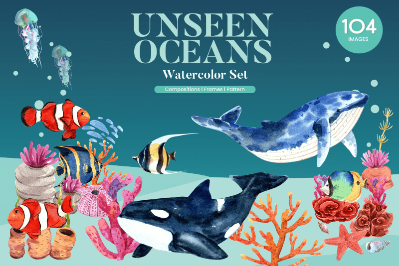 A huge collection of watercolor designs that contains 900+ colorful hand painted elements including a variety of bakery themes, floral designs, work from home themed illustrations, underwater scenes & animals & many more!