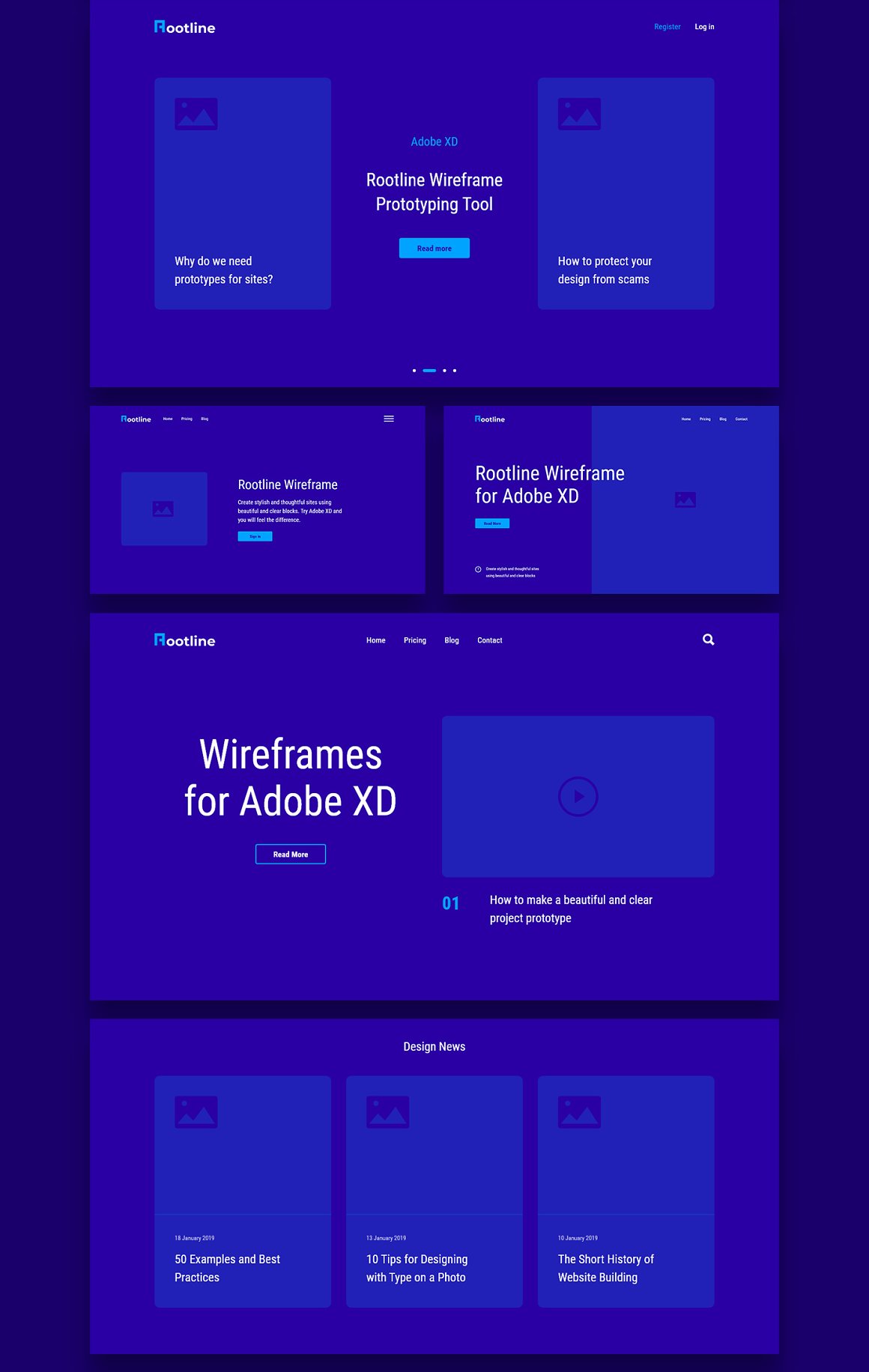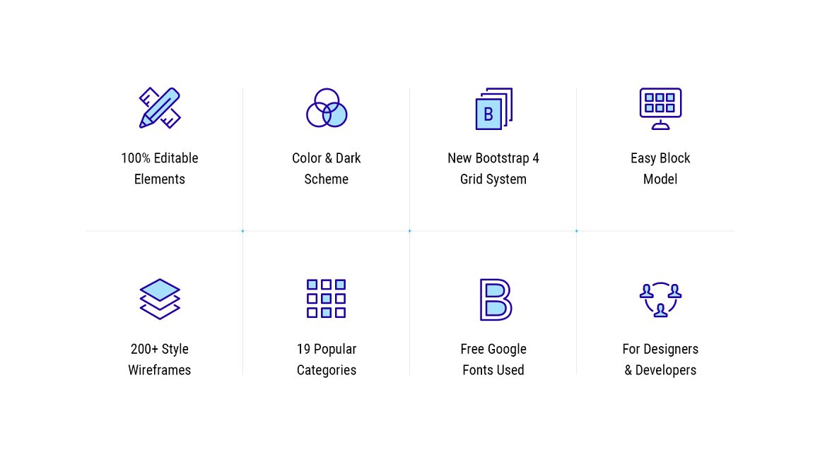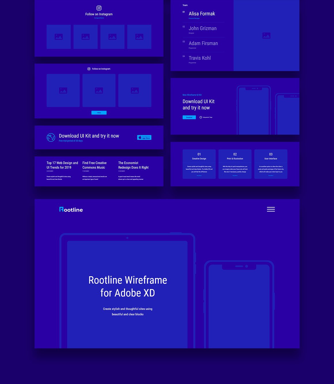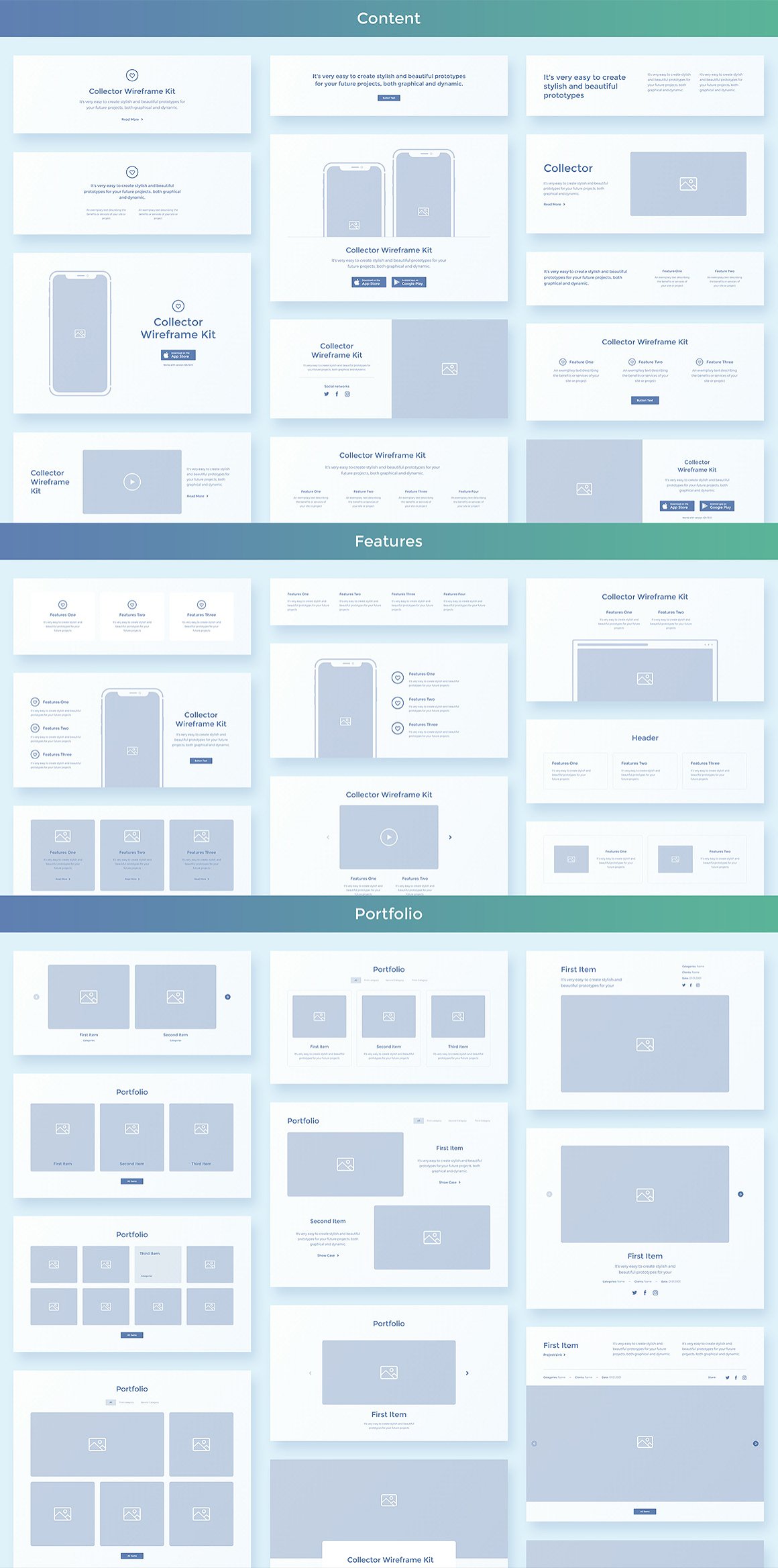 The pack delivers each kit separately so you’ll get a collection with wireframe kits and UI kits for Figma, Adobe XD & Adobe Photoshop with a huge variety of layouts with bootstrap grids for web, mobile & tablets, fully customizable, with use ready screens & web pages