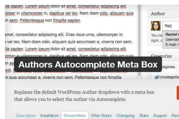 Replaces the default WordPress Author dropdown with a meta box that allows you to select the author via Autocomplete. Download Version 1.1The Authors Autocomplete shows the author’s display name, login and email address to help you select the correct author. Once selected, the author’s gravatar is displayed to the left.