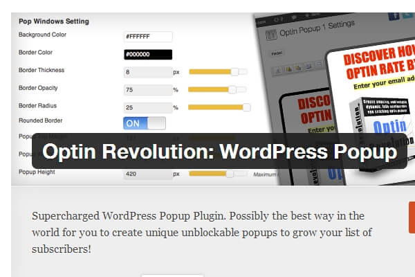 Supercharged WordPress Popup Plugin. Possibly the best way in the world for you to create unique unblockable popups to grow your list of subscribers! Download Version 1.1.7Optin Revolution main settings.Optin Revolution popup settings.Optin Revolution iintegration with WordPress Media Library.