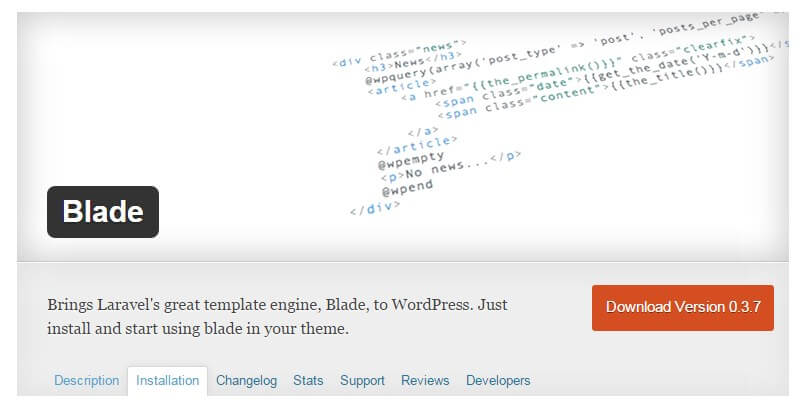 To instal it, just upload the folder to the plugins directory, activate it, make sure /wp-content/plugins/blade/storage/views/ can be written by PHP, and start using. It was crafted by Mikael Mattsson.