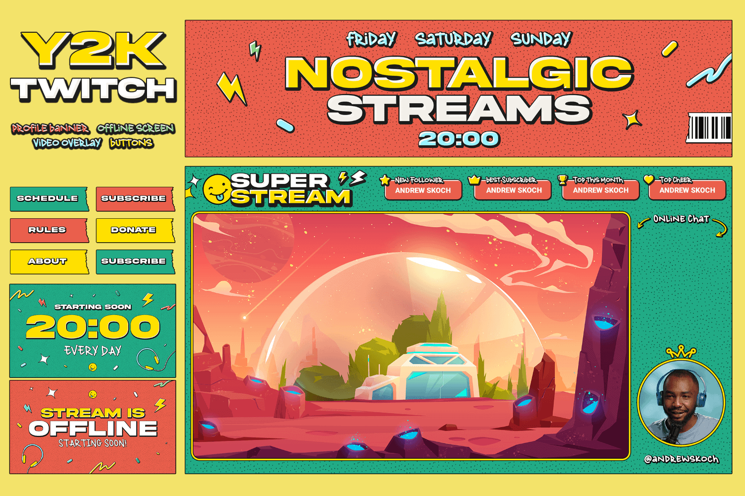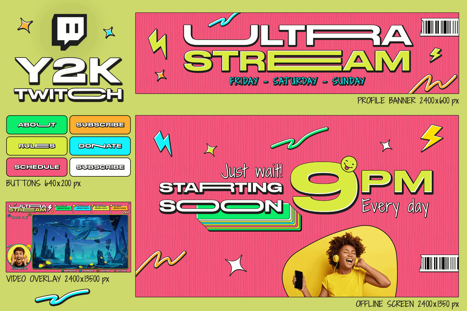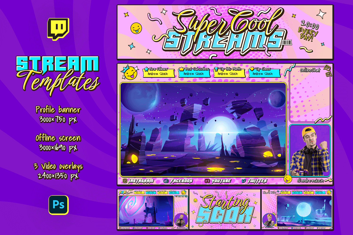 - Twitch templates for video overlays, screens, profile banners and buttons