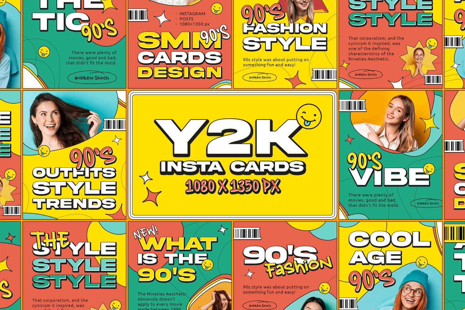 Create stunning 90s and Y2K aesthetic templates for social media branding/content with this collection of PSD templates featuring text effects, overlays, banners, posts, stories, cards and more